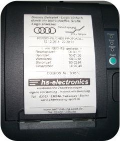 Ein optionaler Thermodrucker bringt die Messergebnisse unmittelbar nach der Zieldurchquerung sofort zu Papier. Der Teilnehmer erhält somit seine gemessene Daten als Bonausdruck