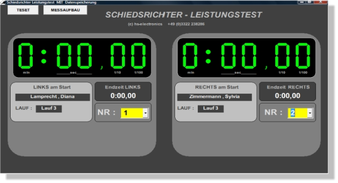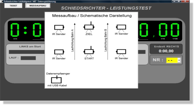 Zeitmessanlage für Schiedsrichter Leistungstests. Die Zeitmessung ermöglicht Zeitnahmen für 2 getrennte Bahnen mittels Lichtschranken